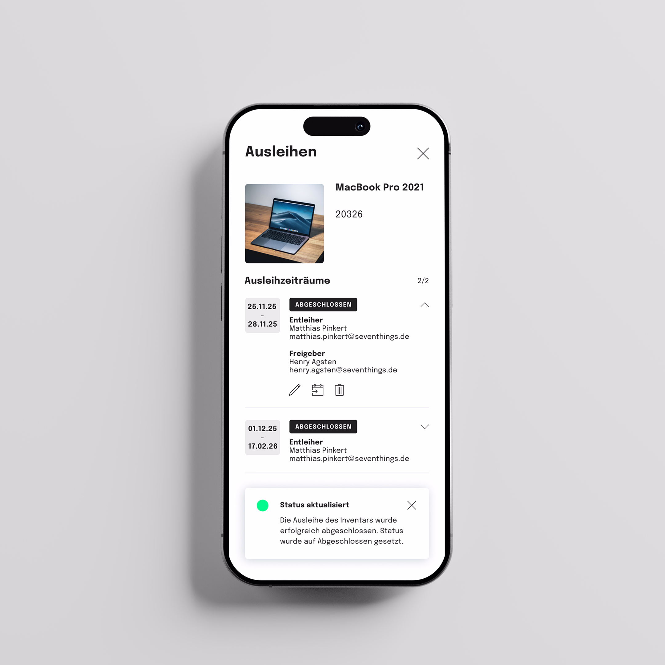 Sie wissen zu jeder Zeit, wer welches Asset aktuell nutzt. Mit nahtlosem „Zuweisen & Weitergeben“ schaffen Sie verbindliche Verantwortlichkeiten und maximale Transparenz.
